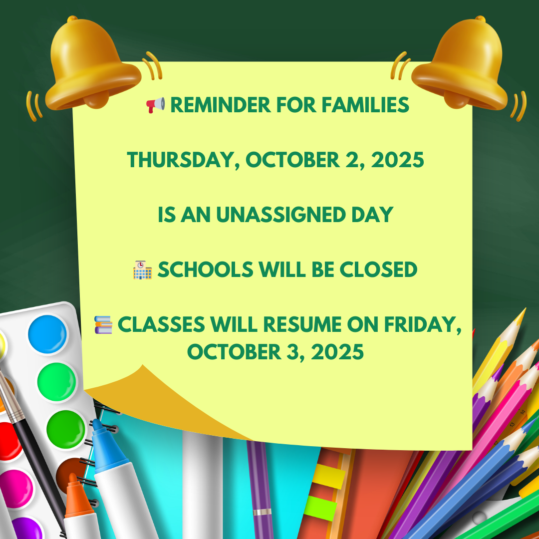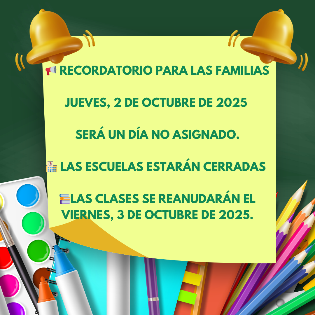 Unassigned Day / Día No Asignado Clases will resume on Friday 10/03/2025Las clases se reanudarán el viernes 10/03/2025 Published September 30, 2025 Print