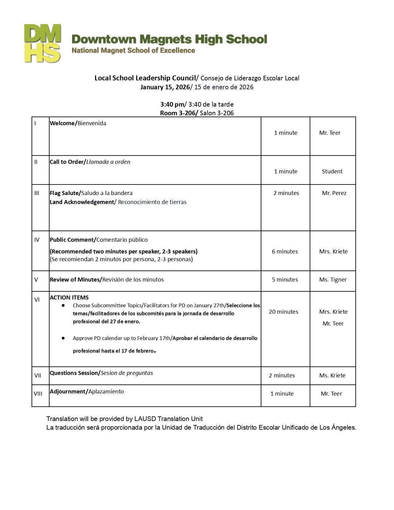 Local School Leadership Council/ Consejo de Liderazgo Escolar Local