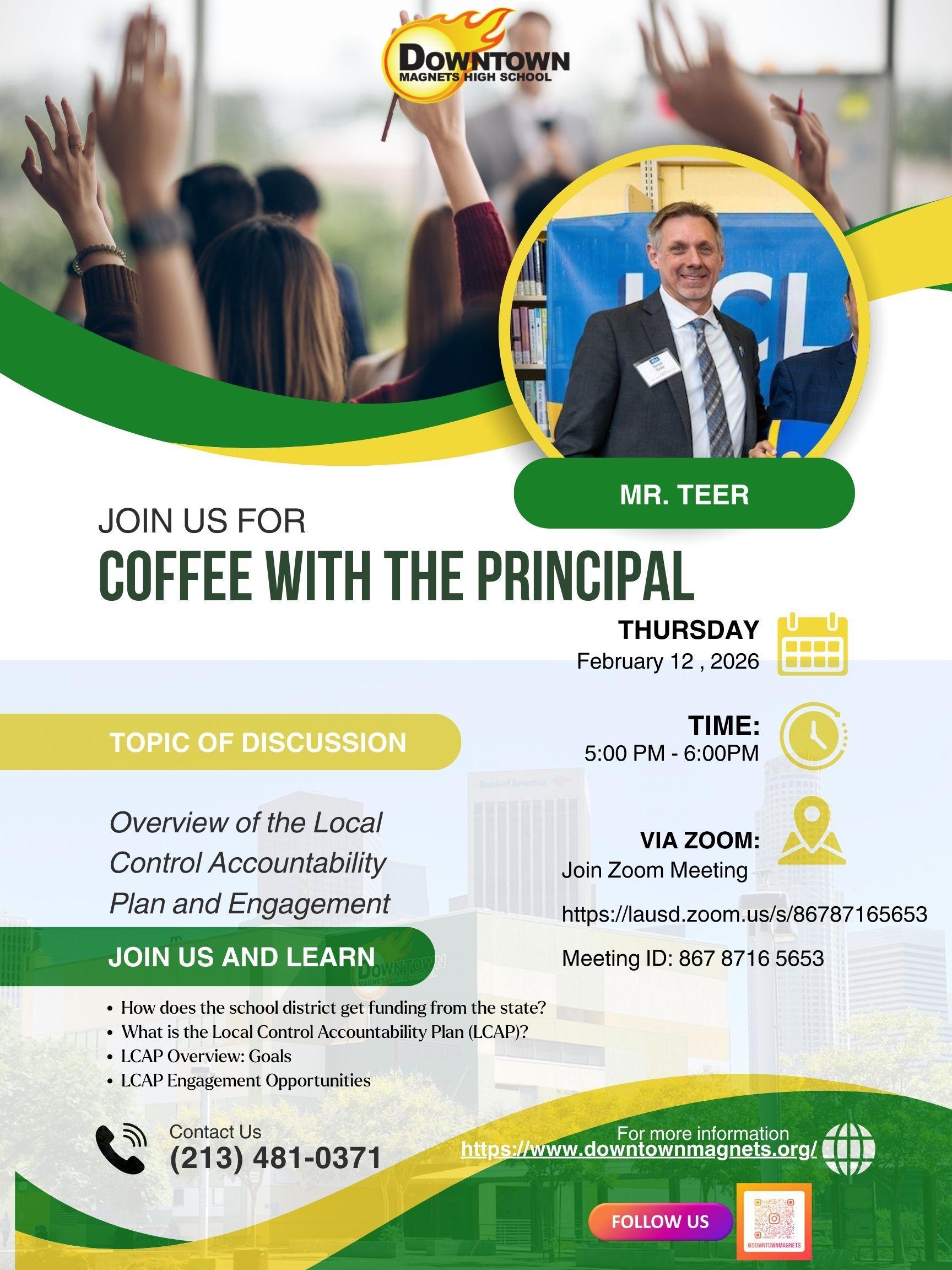 COFFEE WITH THE PRINCIPAL / CAFÉ CON EL DIRECTOR THURSDAYFebruary 12, 2026TIME:5:00 PM - 6:00PMVIA ZOOM:Join Zoom Meetinghttps://lausd.zoom.us/s/86787165653Meeting ID: 867 8716 5653 Published February 3, 2026 Print