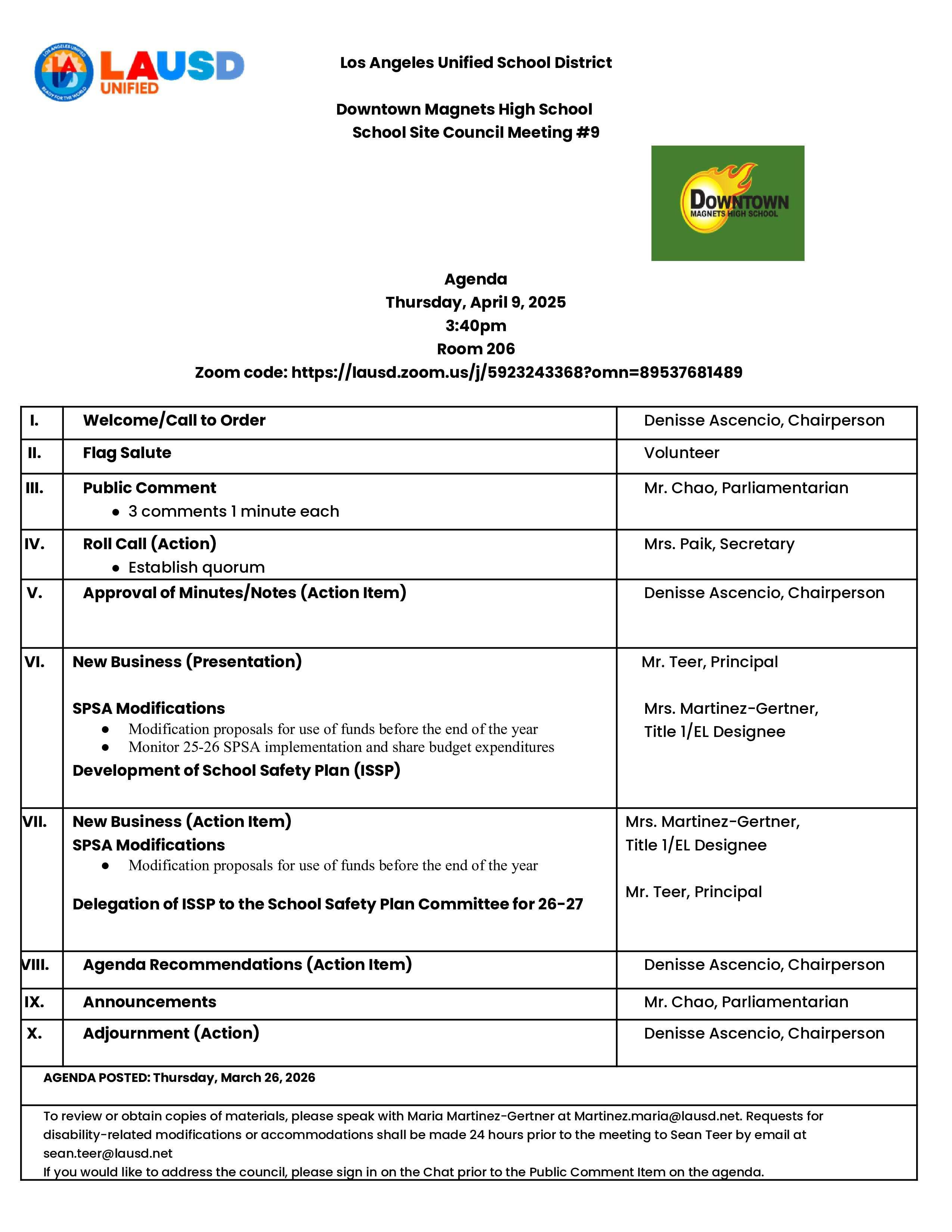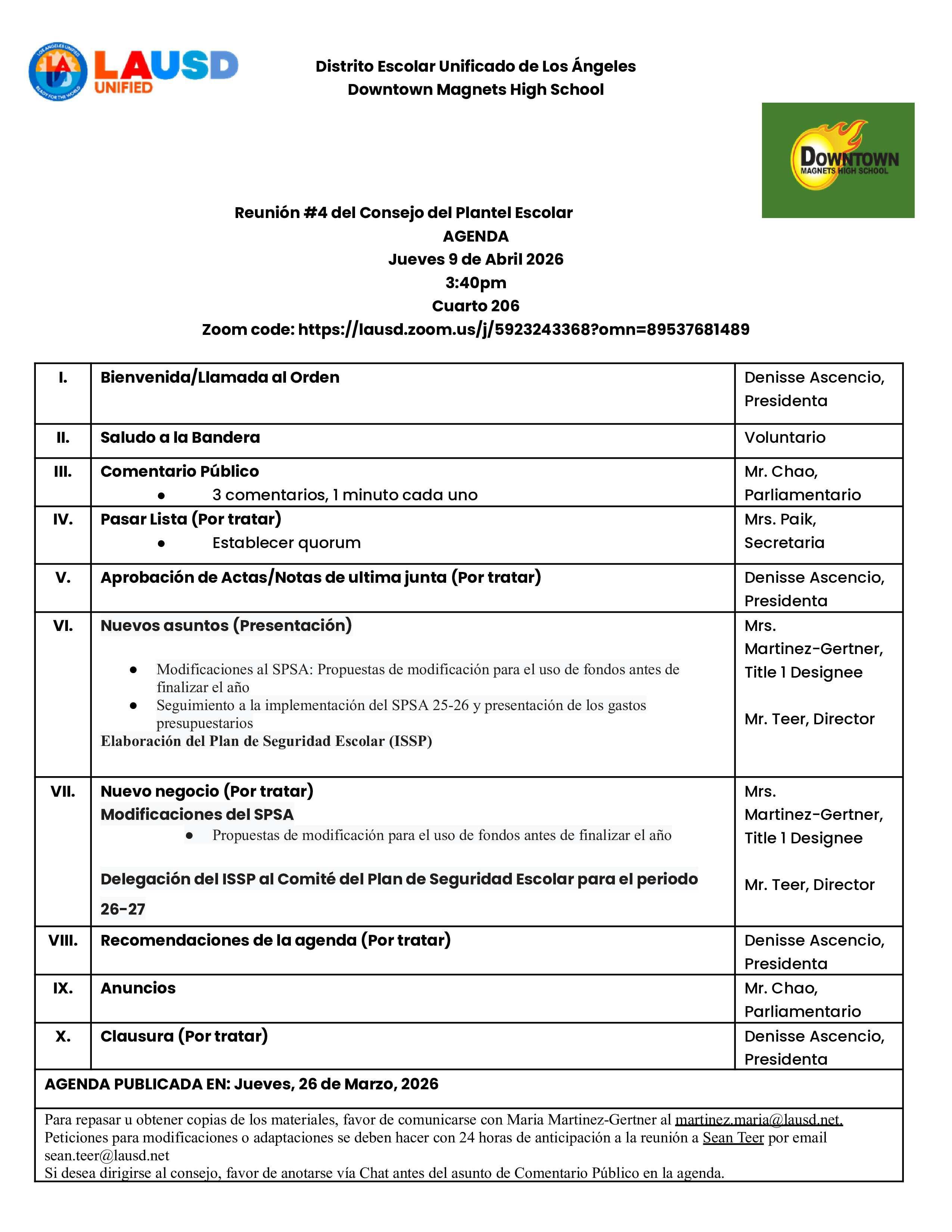 Downtown Magnets High School School Site Council Meeting #9 Thursday, April 9, 2025 3:40pm Room 206 Zoom code: https://lausd.zoom.us/j/5923243368?omn=89537681489 Published April 9, 2026 Print